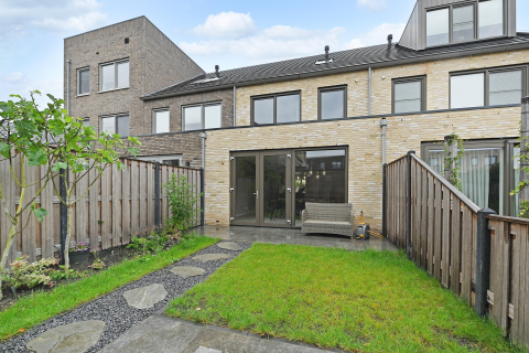 De voortuin is ruim en biedt toegang naar de woning. De op het westen gelegen achtertuin is heerlijk zonnig, voorzien van een vrijstaande stenen berging en een deur naar de achtergelegen poort.